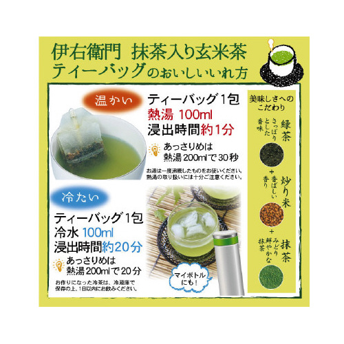 お湯出し・水出しが可能。香ばしい玄米茶に、抹茶を加え、みどりさわやかな色と香り広がる豊かな味わいに仕上げました。