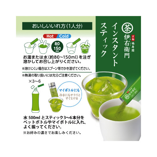 簡単手軽な、伊右衛門インスタント緑茶スティックシリーズ。飲みたい分だけ、開封してすぐに利用可能。お湯でも水でもお飲みいただけます。