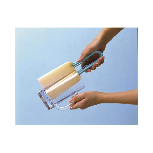 柄が付いたキッチン用のスポンジです。長いサイズなので、底まで手の入らない丈の長いコップを洗うのに最適です。スポンジにコップをはさんで回しながら使えば、両面を一度に洗うことができます。