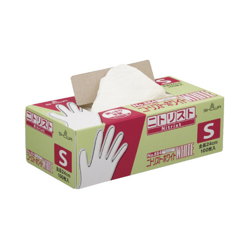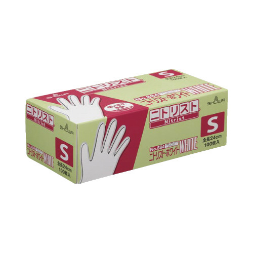 清潔感のあるホワイトで、均一な厚みで破れにくい、厚さ約0.1mmと耐久性に優れた使い捨てニトリルゴム手袋(粉なし)
