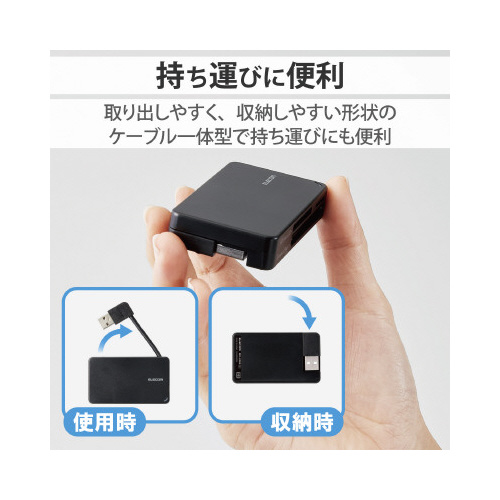 持ち運びや収納に便利なケーブル収納タイプで、42種類のメディアに対応したUSB2.0カードリーダーです。