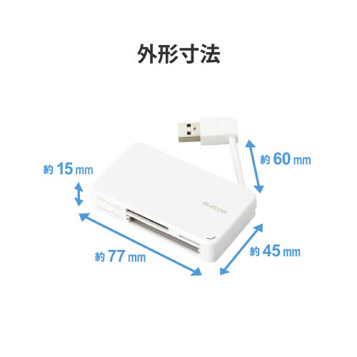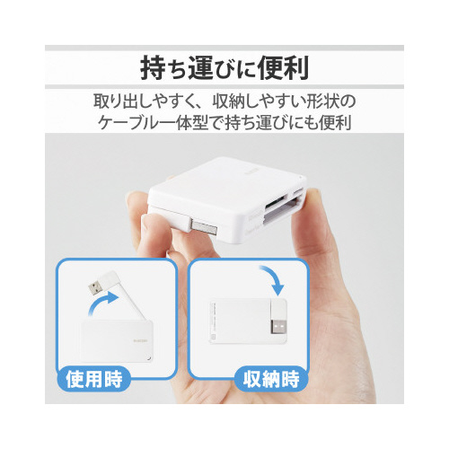 持ち運びや収納に便利なケーブル収納タイプで、42種類のメディアに対応したUSB2.0カードリーダーです。