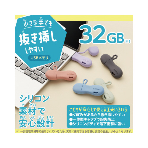 プログラミング教室や習いごとのデータ持ち運びにピッタリ!小さい手でも抜き差ししやすく、落としても壊れにくいやわらかシリコンボディーの子ども向けUSBメモリです。