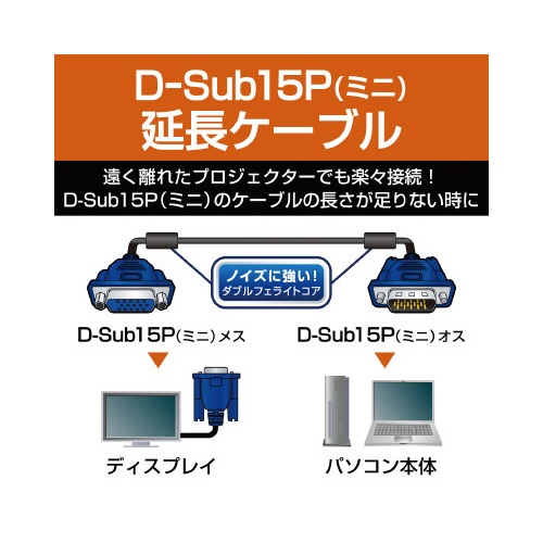 遠く離れたプロジェクターでも楽々接続。D-Sub15ピン(ミニ)のディスプレイケーブルを延長できる、ディスプレイ延長ケーブル。