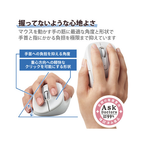 整形外科医との共同開発により自然な手の形のまま使える、握らないマウス“EX-G”シリーズ。マウスを動かす際にかかる身体の負担を極限まで抑えた無線2.4GHz5ボタンマウスです。