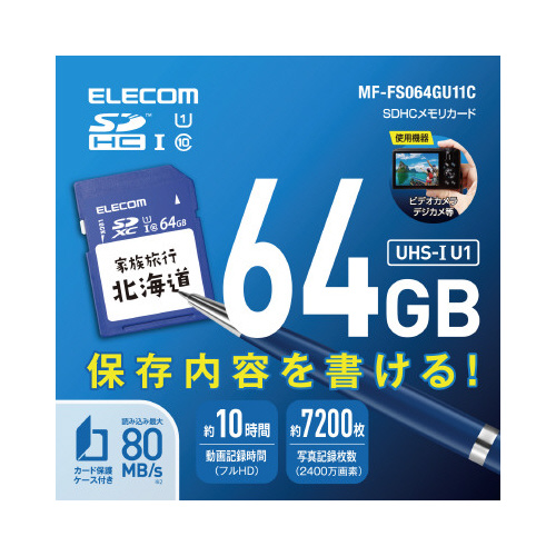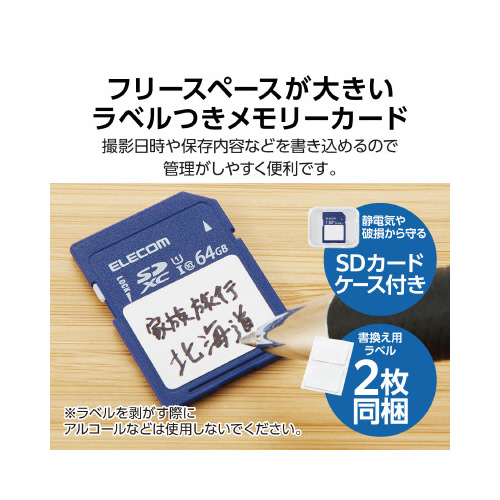 撮影日時や保存内容などを書き込める、フリースペースが大きいラベルを採用したSDXCメモリカード。読み込み最大80MB/sで画像や動画の表示も速いのが特長。貼り替え用のラベルとSDカードケース付きです。