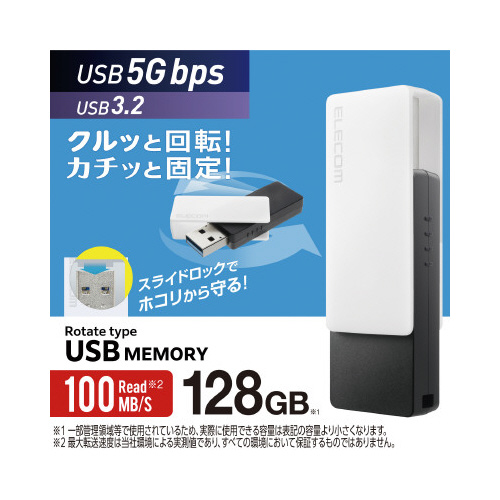 キャップを紛失する心配のない回転式コネクターカバータイプのUSBメモリ。USB5Gbps(USB3.2(Gen1))に対応し、読み込み時最大100MB/sの高速データ転送を実現しています。