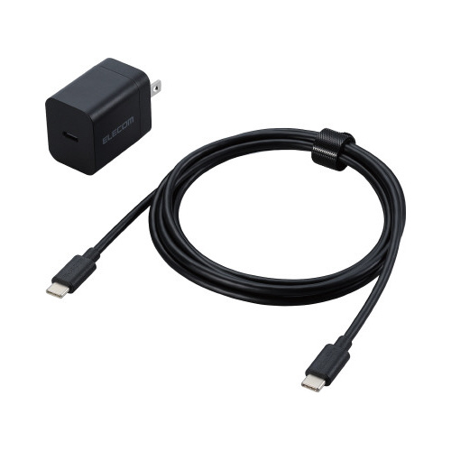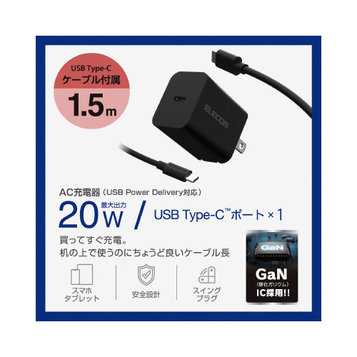 USBPowerDeliveryに対応したUSBType-Cポートを1ポート搭載し、対応するスマートフォン、タブレットなどを充電できるUSBAC充電器。長さ約1.5mのC-Cケーブル付属。