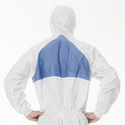 塗装・工場清掃メンテナンス作業推奨の化学防護服です。背中はムレを軽減するブリーザブルパネル付。フード前面、腰、足首にゴムひもを縫い込み、危険物の侵入や防護服のダブつきを抑え動きの妨げを軽減します。