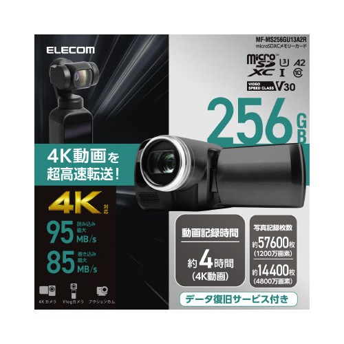 ビデオカメラやVlogカメラにおすすめ!4K対応のmicroSDXCメモリーカードです。