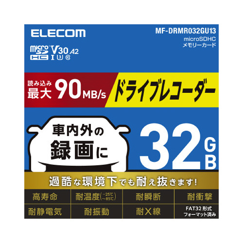 運転時の万が一に備える!ドライブレコーダー用microSDHCメモリーカードです。高耐久モデルで、過酷な車内環境下でも安心して使用できます。