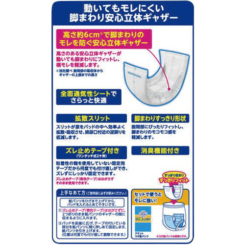 脚まわりからのモレを防ぐ「安心立体ギャザー」。やわらかな通気性バックシート採用。