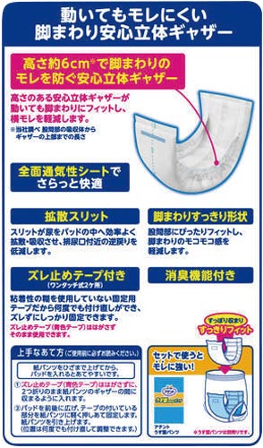 脚まわりからのモレを防ぐ「安心立体ギャザー」。全面通気性シート採用。やさしい肌触りのクロスライクシートを採用。