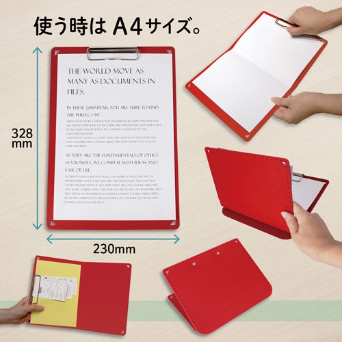 半分に折りたためるクリップボード。使うときはA4、折りたたむとA5になって持ち運びしやすいクリップボード。折り目部分もフラットになって書きやすい。