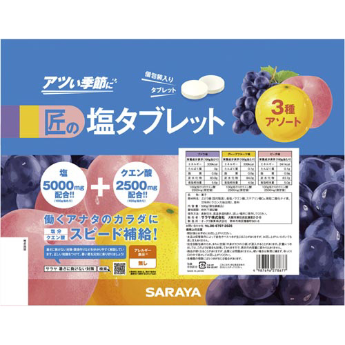 噛んですばやく塩分補給が出来る、人工甘味料不使用の塩タブレットです。味はブドウ、ピーチ、グレープフルーツ味の3種類。水分補給時に食べることで、暑さで失われる塩分と糖分の補給ができます。