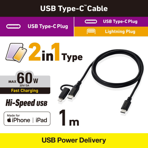 Type-C・Lightningポートの両方に使える1台2役!Lightningプラグへの変換アダプター付きType-Cケーブルです。