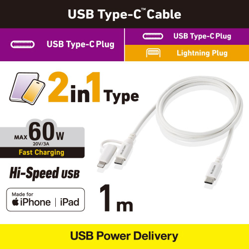 Type-C・Lightningポートの両方に使える1台2役!Lightningプラグへの変換アダプター付きType-Cケーブルです。