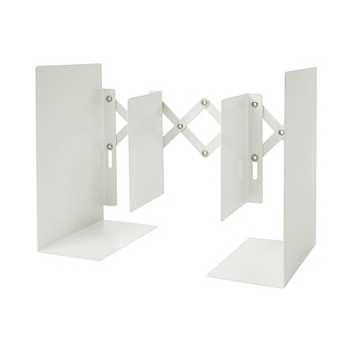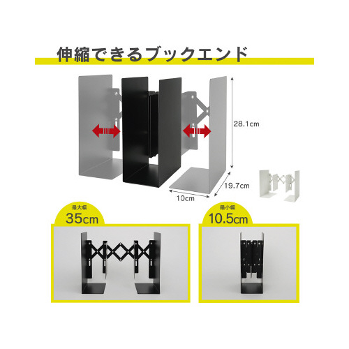 書籍の量に応じて開閉幅を調節できる伸縮型ブックエンドです。丈夫で耐久性の高いスチール素材は、堅固で形崩れしにくく、書籍の重さで生じるズレや開きを防止。背あてにより後方に書籍がおちることもありません。