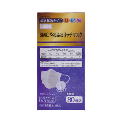 やわらか素材でぴったりフィット!携帯に便利で衛生的な個別包装タイプ。ウイルス飛沫捕集効率試験・微粒子ろ過効率試験・バクテリア飛沫捕集効率試験:99%カット (一財)カケンテストセンター測定