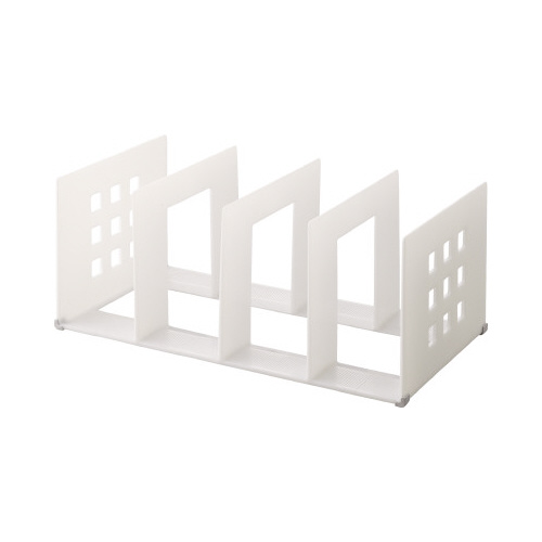 タテ置き・ヨコ置きどちらでも使用できる仕切ラック。底の四隅のL字型の滑り止めがラックの滑りを防止します。