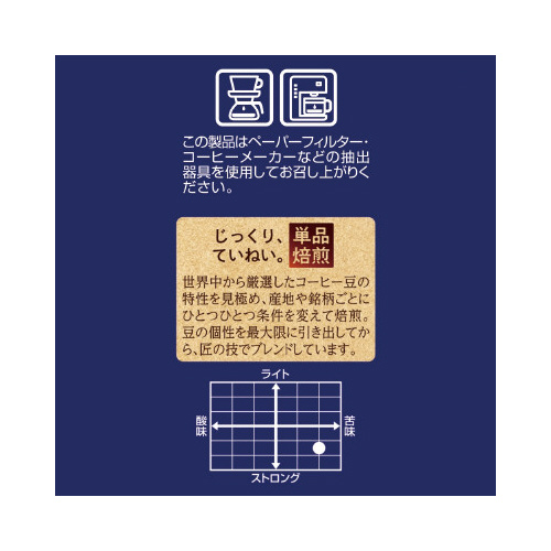 毎日のおいしさをいつでも手軽に!「単品焙煎」をし、豆の個性を最大限に引き出しました。コク深く芳醇な味わい。ヘビーユーザーに嬉しい、お徳用600gの大容量サイズです。
