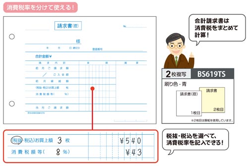 軽減税率制度に対応したインボイスタイプの合計請求書です。税抜・税込を選べて消費税率を記入できます。納品書で消費税計算をしない場合、こちらの合計請求書をお使いください