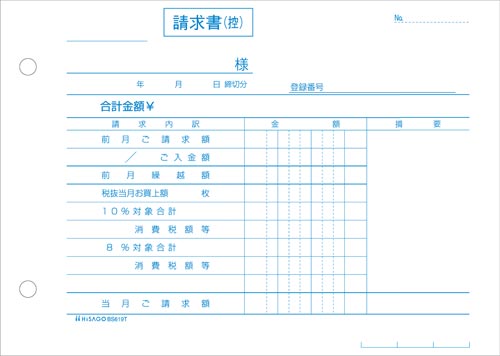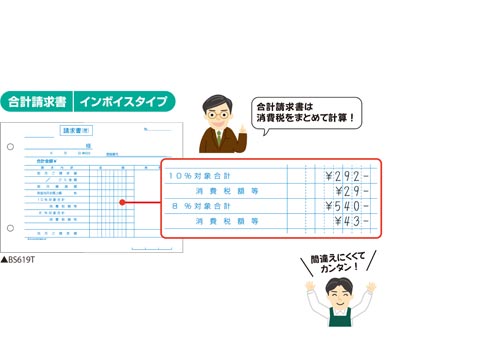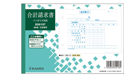 軽減税率制度に対応した、インボイスタイプの合計請求書です。納品書で消費税計算をしない場合、こちらの合計請求書をお使いください。2枚目は、厚紙を使用しています。