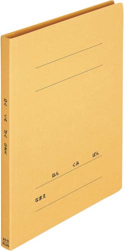 ひらがなで「ねん・くみ・ばん・なまえ」が印刷された、低学年向けのフラットファイル。迷わず書けて、きれいに揃う。