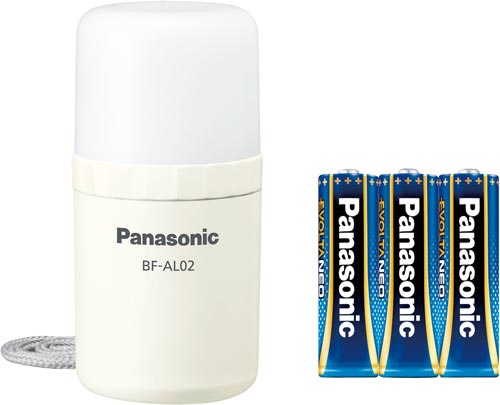 持ち運びに便利なコンパクトランタン。LED+乾電池エボルタNEOで約77時間連続使用可能。紐の採用で吊り下げ場所が大幅に拡大。小雨の中でも使用可能な防滴構造(IPX1相当)。