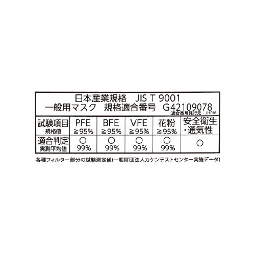 ※BFE(細菌ろ過効率)、PFE(微粒子ろ過効率)、VFE(ウイルスろ過効率)は、フィルターの細菌や微粒子遮断効率を示す数値で、数値が高いほど遮断率に優れています。
