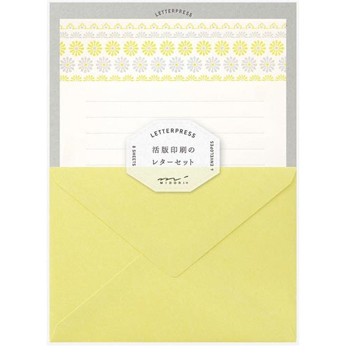 大人の女性のための上品で上質な活版印刷のレターセットです。活版印刷ならではの繊細な手触りと美しい陰影をお楽しみいただけます。モダンな黄色とグレーの組み合わせ花ライン柄は、様々なシーンで活躍します。