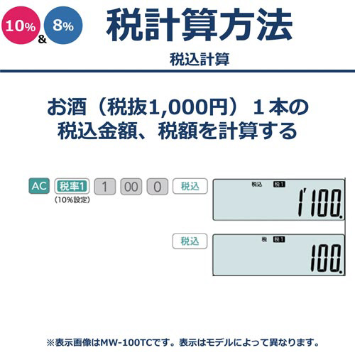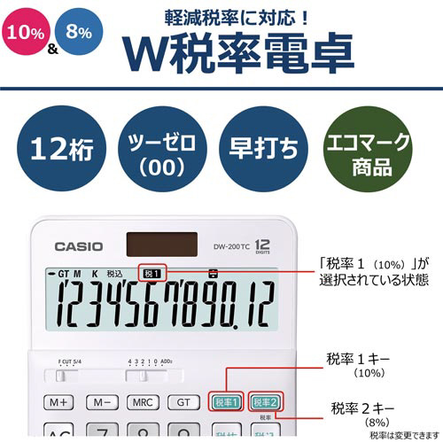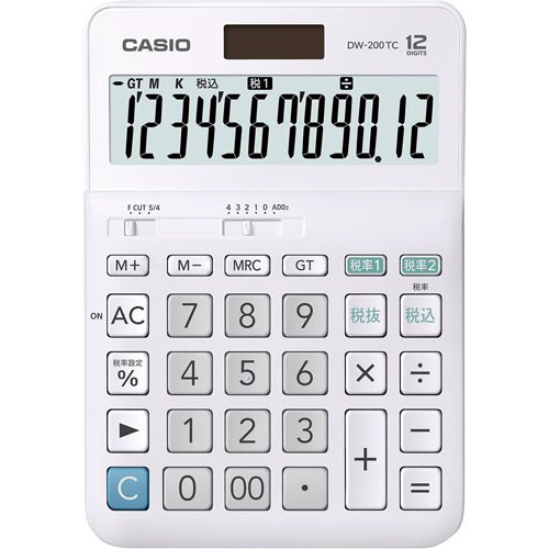 ●演算状態表示:有、四捨五入:有、税計算:有、切り捨て:有、検算:無、切り上げ:無、早打ち:有、3桁区切り、税率2通り設定、マルチ%、四則定数計算、概数計算、桁下げ、2つの税率計算可能、傾斜表示、オートパワーオフ