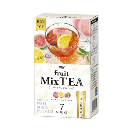 ピーチ、レモン、グァバの3つの果実と紅茶で仕立てました。お湯や水で溶かすだけで、手軽にビタミンC入りのフルーツミックスティーがお楽しみいただけます。