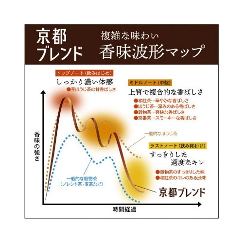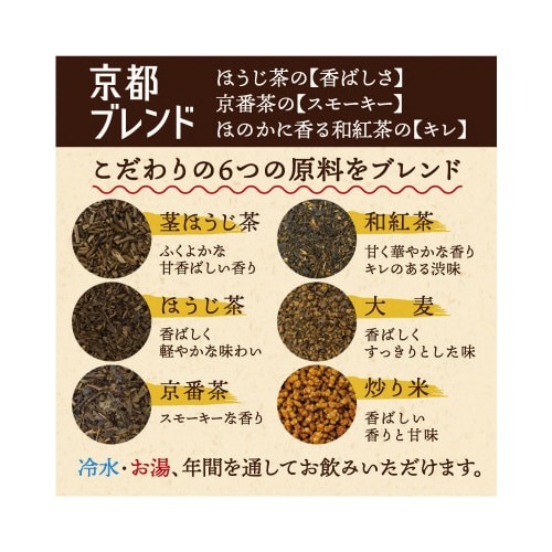 老舗茶舗福寿園発祥の地、京都で昔から愛飲されるスモーキーな京番茶が隠し味。茶匠がそれぞれの長所を最大限に活かし、自慢の焙煎技術によりキレ良く軽やかな喉越しの甘香ばしい味わいに仕上げました。