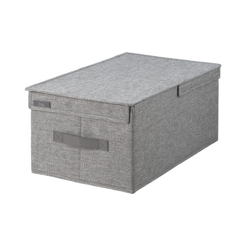 フタを全部取らずに中身が確認できる。フタ裏に防虫剤を入れられるポケット付き。幅30cmのフィッツケースの上に乗せられるサイズ。しっかりした芯材入りで型崩れしにくい。