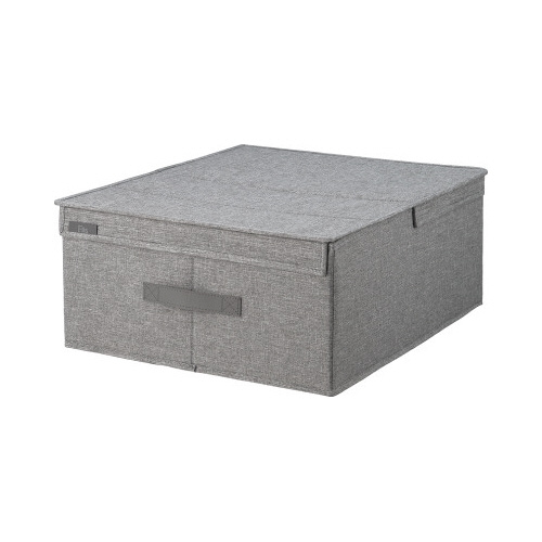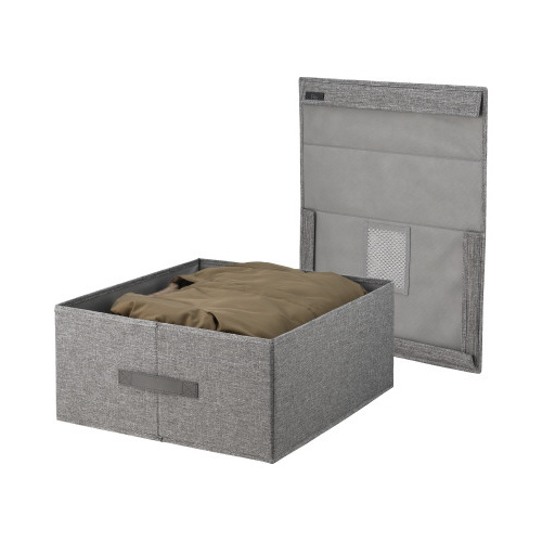 フタを全部取らずに中身が確認できる。フタ裏に防虫剤を入れられるポケット付き。幅44cmのフィッツケースの上に乗せられるサイズ。しっかりした芯材入りで型崩れしにくい。