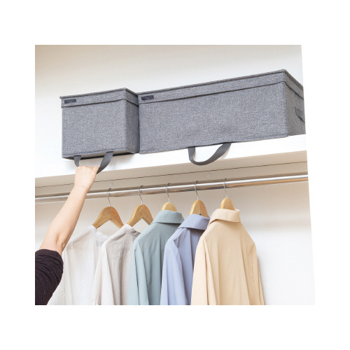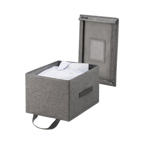 ●生産国/中国ハーフタイプ。棚上から引き出しやすい取っ手付き。フタ裏に防虫剤を入れられるポケット付き。しっかりした芯材入りで型崩れしにくい。