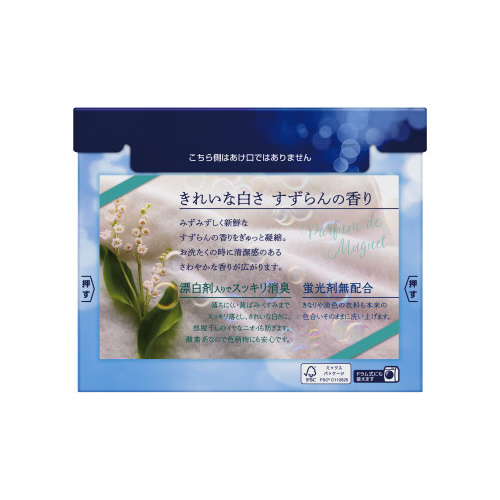 きれいな白さですずらんの香り広がる。酸素系漂白剤入りですっきり消臭。蛍光剤無配合。