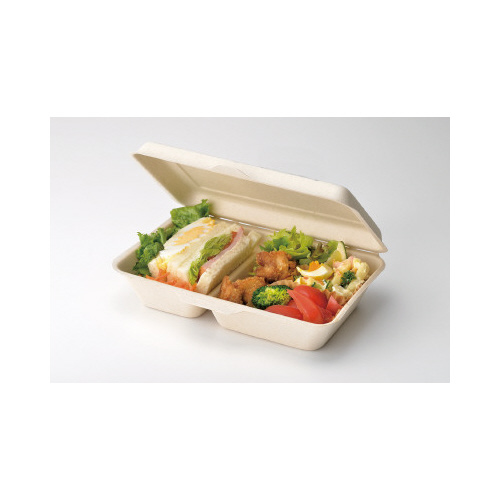麦わらパルプを使い環境に配慮した、紙製のモールドフードパック。仕切りで中身を分けて盛り付けられる。
