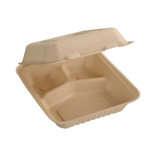 麦わらパルプを使い環境に配慮した、紙製のモールドフードパック。三つ仕切りでセパレートして盛り付けられる。