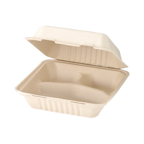 麦わらパルプを使い環境に配慮した、紙製のモールドフードパック。三つ仕切りでセパレートして盛り付けられる。