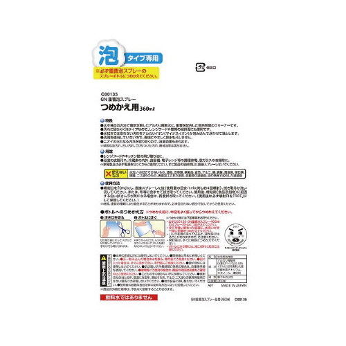 ※噴射口を「ON」にし、直接スプレーした後(使用料の目安:1平方mに対し約4回噴射)、拭き取るか洗い流してください。または、布等に含ませて拭き取ってください。使用後、増粘剤(食品添加物)に起因する白い拭きムラが気になる場合は、再度拭き取ってください。