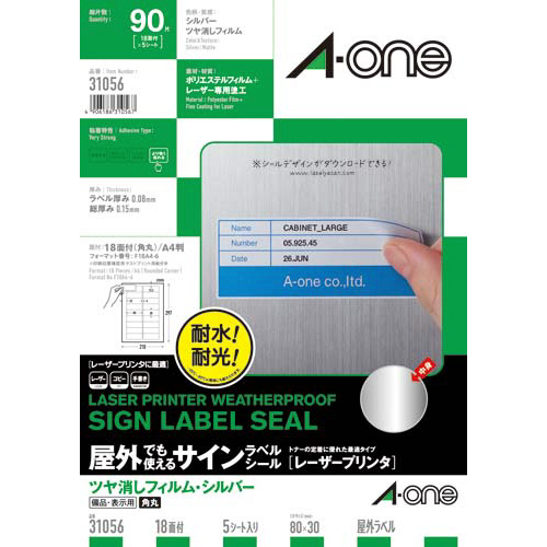 レーザープリンタ(LBP)で印刷できる、屋外でも使えるシルバーツヤ消しフィルム素材のラベルシールです。耐水性、耐光性に優れています。光の反射を抑えるツヤ消し加工で印刷が見やすい。備品管理シール作成に。