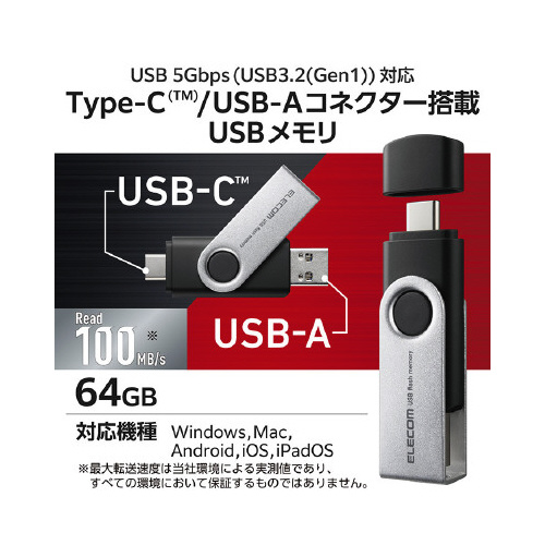 パソコン・スマートフォン・タブレットなど異なるデバイス間のデータ移動もこれ1つ。Type-C/USB-A両方のコネクターを搭載したUSBメモリ。USB5Gbps(USB3.2(Gen1))対応。
