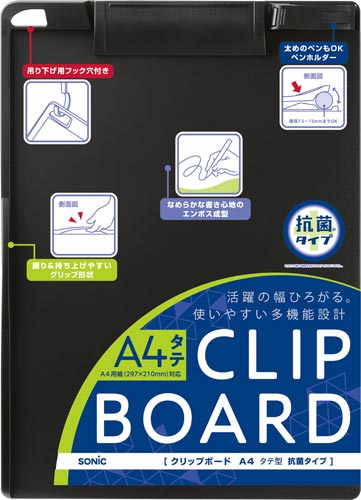 抗菌加工を施したA4サイズタテ型のクリップボードです。JISZ2801に準拠した試験で抗菌効果が確認された素材(無機系抗菌剤)を使用しております。問診表などの記入や、アンケートの回覧に最適。