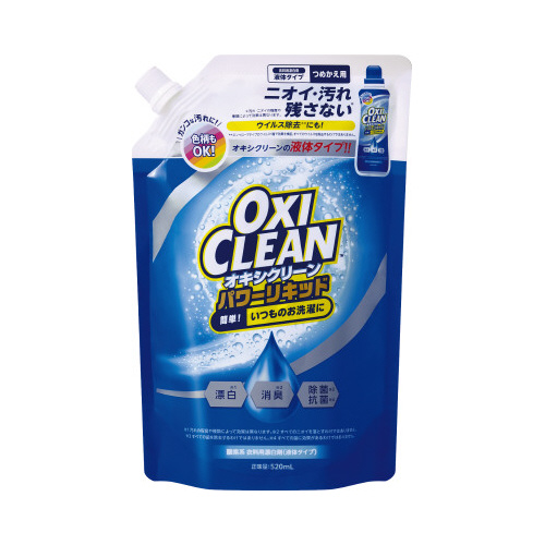 いつものお洗濯にオキシクリーンのパワーを足す、オキシクリーンパワーリキッド!頑固な汚れと気になるニオイに!液体だから冷水でも溶け残らず色柄物にも使える、さらに進化したオキシクリーンです。