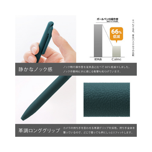 使う人も周りの人も心地よく使えるボールペン、Calme(カルム)。手に馴染む革調ロンググリップ、環境に調和する静音設計と、日常のシーンに溶け込むボディカラー。