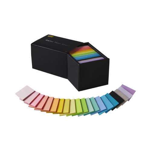 強粘着タイプのポストイット。マルチカラーの全20色を1箱に詰めた「全色パック」です。豊富なカラーから好みの色を選んで、仕事を楽しく、効率的に!
