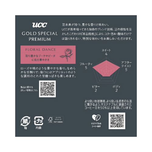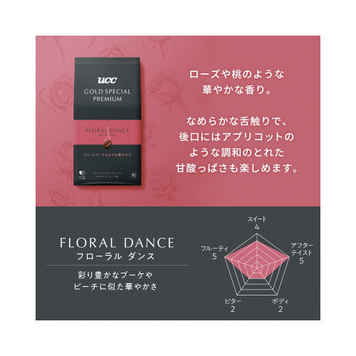 長年培ってきたUCCのブレンド・焙煎技術で、新たなコーヒーの楽しみ方をご提案。コク・苦み・酸味だけでは語りきれない特別な味わいを実現しました。彩り豊かなブーケやピーチに似た華やかさ。