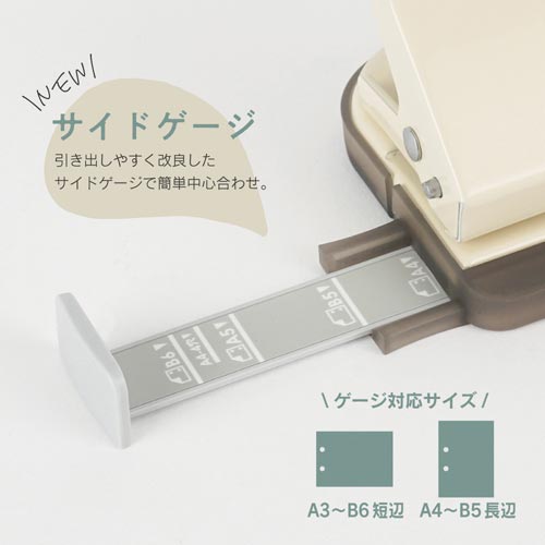 コンパクトで美しいカラーと機能が豊富な2穴パンチです。用紙の中央合わせに便利なサイドゲージはA4長辺4穴にも対応です。ハンドル部分は押し下げた状態でロックできるので引き出し等にも収納できます。